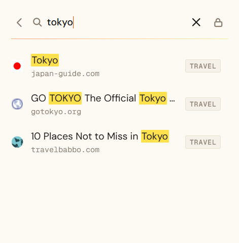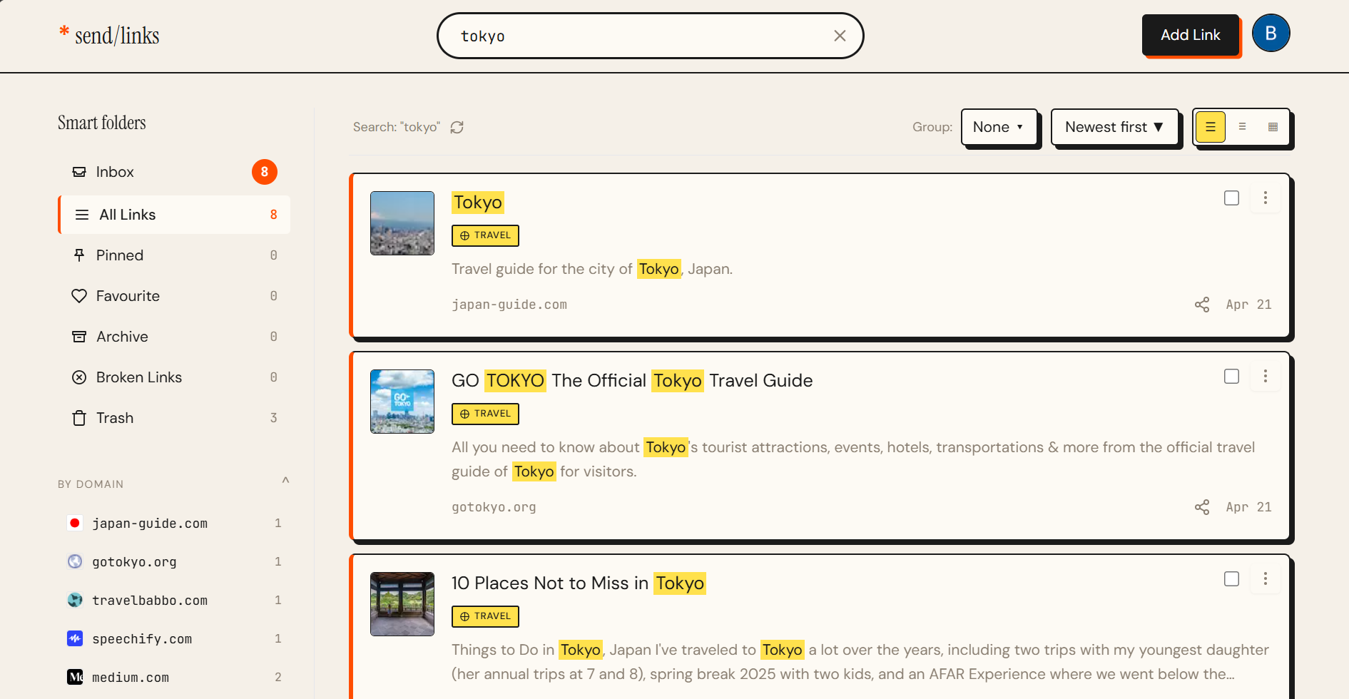 Search by keyword. If you only remember a fragment, a word from the title, the domain name, something about the content, search finds it. Results pull from titles, descriptions, and domains, not just exact matches.